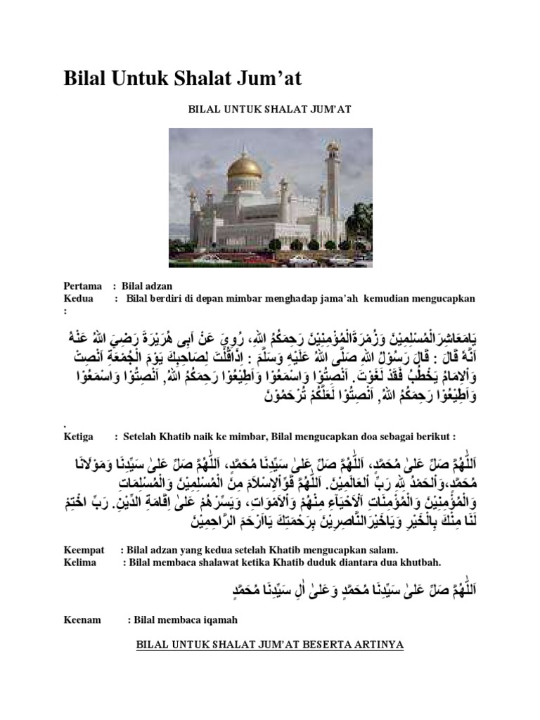 Yakni saat khatib jumat duduk antara dua khutbah. أللّهُمَّ صَلِّ وَسَلِّمْ وَزِدْ وَدِمْ وَأَنْعِمْ وَتَفَضَّلْ وَبَارِكْ بِجَلاَلِكَ وَكَمَالِكَ عَلَى زَيْنِ عِبَادِكَ وَأَشْرَفِ عُبَّادِكَ وَأَسْعَدِ اْلعَرَبِ وَالْعَجَمِ apakah hukum nya membaca selawat saat khatib duduk diantara dua khutbah.bukankan selama khatib berkhutbah makmum djwajibkan diam. Penyampaian khutbah jumat terbagi menjadi dua sesi. Kita sudah mengetahui bahwa khutbah jum'at terdapat dua kali khutbah dan imam akan duduk di antara dua khutbah tersebut. Berdoa untuk kaum muslimin ketika khotbah kedua.
