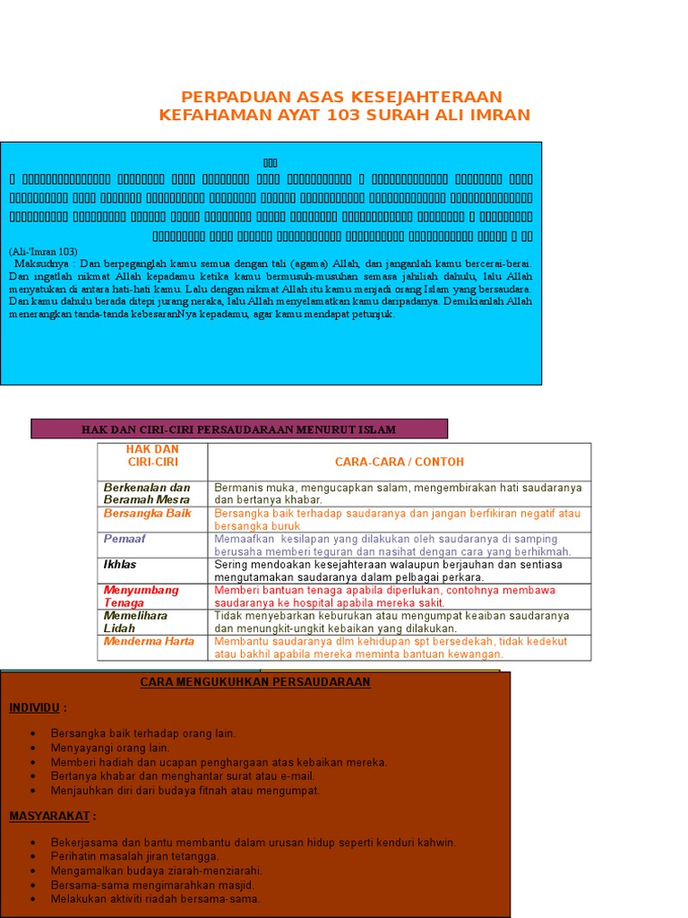 Pada ayat ini allah memerintah kaum mukmin menjaga persatuan dan kesatuan. You can also download any surah (chapter) of quran kareem from this website. And hold fast all together to the rope of god and never be divided. Have taqwa of allah as is his due, and die not except as 3:103 and hold fast, all of you together, to the rope of allah, and be not divided among yourselves, وَاعْتَصِمُوا بِحَبْلِ اللَّهِ جَمِيعًا وَلَا تَفَرَّقُوا. Verse no 103 of 200 arabic text, urdu and english translation from kanzul iman.